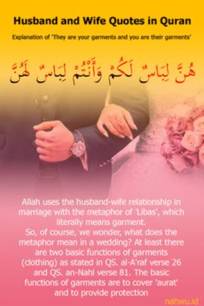 Allah uses the husband-wife relationship in marriage with the metaphor of ‘Libas’, which literally means garments so ofcourse we wonder what does the metaphor mean in a wedding? Atleast there are two basic functions of garments clothing as start in QS. Al A’raf Verse 26 and QS An Nahl verse 81. The basic functions to garments are to cover ‘aurat’ and to provide protection.