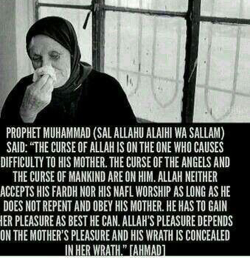 The curse of Allah is on the one who causes difficulty to his mother. the curse of the angels and the curse of mankind are on him. Allah neither accepts his Fardh nor his Nafl worship as long as he does not repent and obey his mother. He has to gain her pleasure as best he can. Allah’s pleasure depends on the mother’s pleasure and his wrath is concealed in her wrath.
