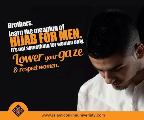 “Brothers Learn the meaning of the Hijab for men. it is not something for women only. lower your gaze & respect women.”