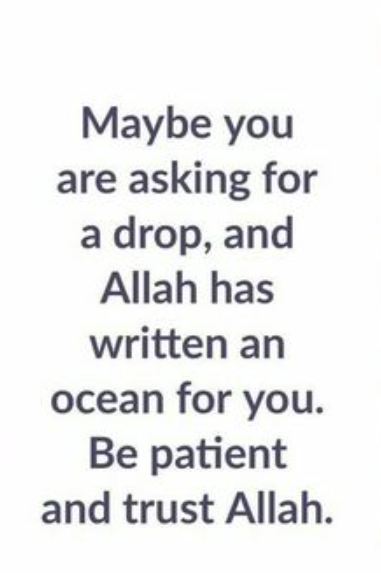 Maybe you are asking for drops, and Allah has written an ocean for you. Be Patient and trust Allah.