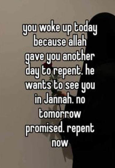 You woke up today because Allah gave you another day to repent. He wants to see you in Jannah. no tomorrow is promised. Repent now.