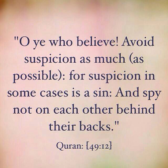 “O ye who believe! Avoid suspicion as much (as possible): for suspicion in some cases is a sin: And spy not on each other behind their backs. ” {Quran 49:12}