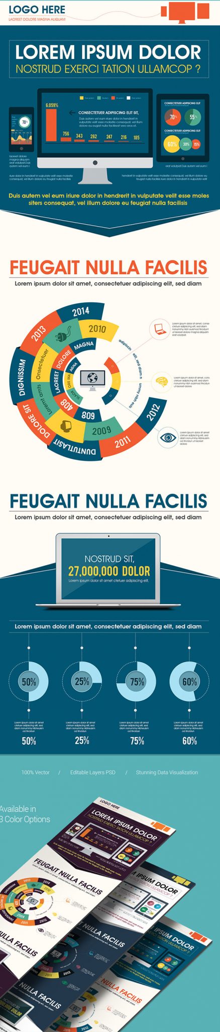 ZippyPixel is great source of high quality freebies. Recently they shared a free simplistic infographics PSD templates with a cool flat design specially for technology based research. This template has a beautiful & colorful circular diagram in the mid. which would look perfect with stats. The bottom section of techno infographhic template has vectors of percentage circles and a laptop vector. The top area has vectors of iPhone, iPad and Mac Monitor. simple Vector graphics have been used in this PSD template organized layers so you can easily edit it and quickly get it ready for work. 3 color versions are already, yet you can also customize the colors according to your desire.