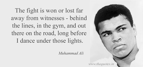 The fight is won or lost far away from witnesses – behind the lines, in the gym, and out there on the road, long before i dance under those lights.