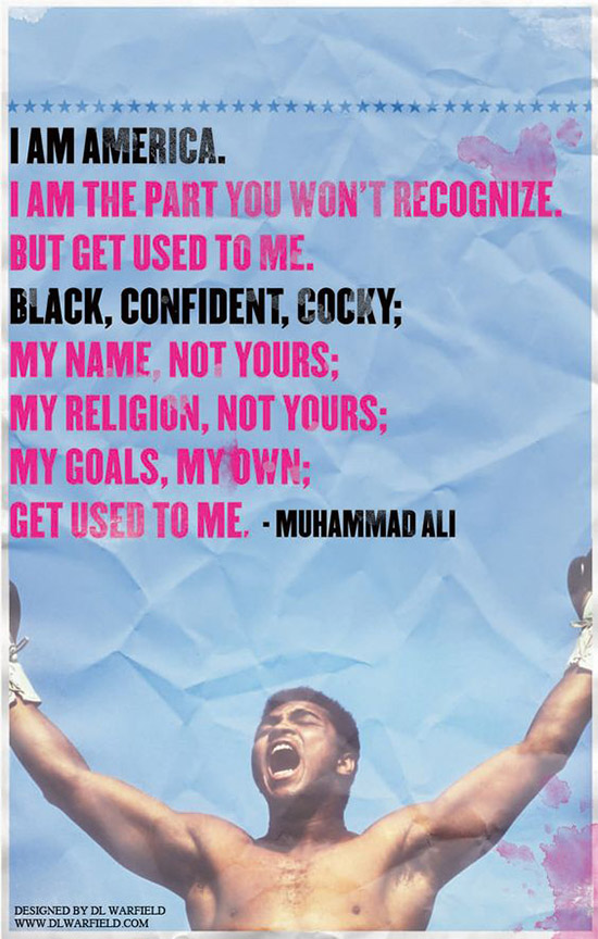I am America. I am the part you won’t recognize. but get used to me. Black confident. Cocky. My Name: Not yours: My religion, Not yours. My goals, My own. Get used to me. – Muhammad Ali