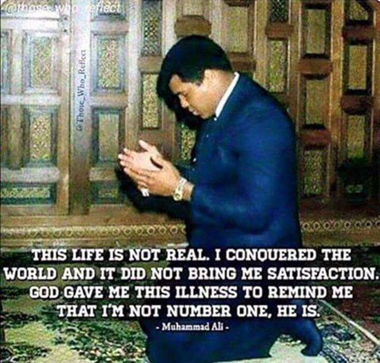 This life is not real. I conquered the world and it did not bring me satisfaction. God gave me this illness to remind me that i’m not number one, He is. – Muhammad Ali Champ