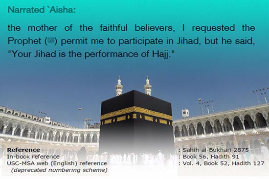 Narrated Aisha: The mother of the faithful believers, I requested the Prophet (Peace be upon him) to permit me to participate in Jihad, but he said, “Your jihad is the performance of Hajj. “