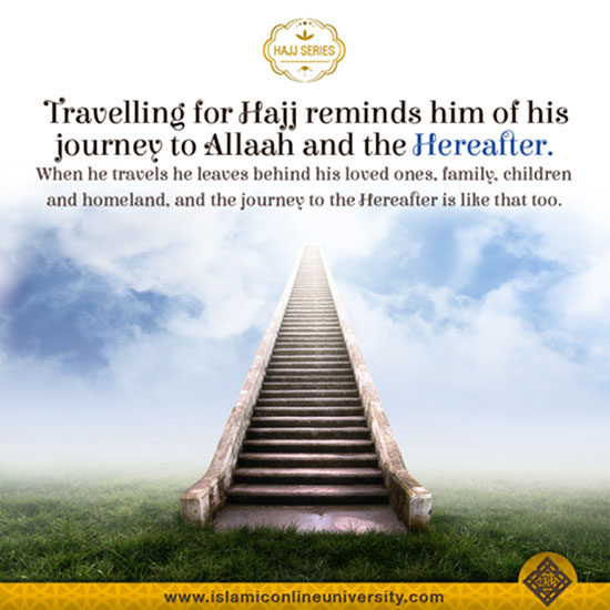Traveling for hajj reminds him of his journey to Allah and the hereafter. When he travels he leaves behind his loved ones, family, children, and homeland. and the journey to the hereafter is like that too.