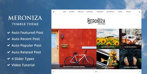 Meroniza is a Premium and Responsive Personal Tumblr Blog Theme with Elegant Design. This theme made for bloggers, content writers, photographers, designers, personal purpose and everyone who need an easy customize, responsive, and modern layout. Meroniza is Easy to use and install, it includes Right/Left Sidebar, 4 slider types, custom sidebars, custom fonts, auto featured post, auto recent post sidebar (Grid/Slider), auto popular post sidebar (Grid/Slider), Related Post, featured tags banner, instagram or flickr on footer, custom CSS code and much more.