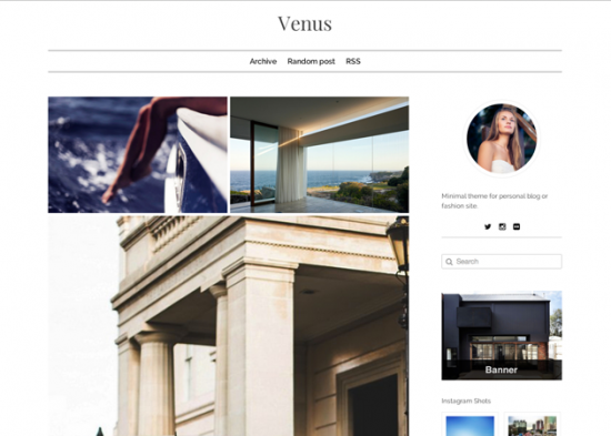 Venus is a simple tumbrl theme to display your Images. Easy to add your social profiles. We support: Facebook, Twitter, Instagram, Flickr, Google Plus, Vimeo and Youtube.