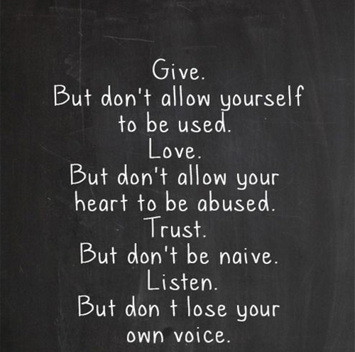 Give. But don’t allow yourself to be used. Love but don’t allow your heart to be abused. Trust Bust don’t be naive. Listen but don’t lose your voice.