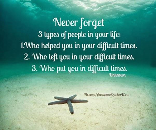 Never forget 3 types of people in your life. 1, Who helped you in your difficult times? 2, Who left you in your difficult times? 3 Who put you in difficult times?