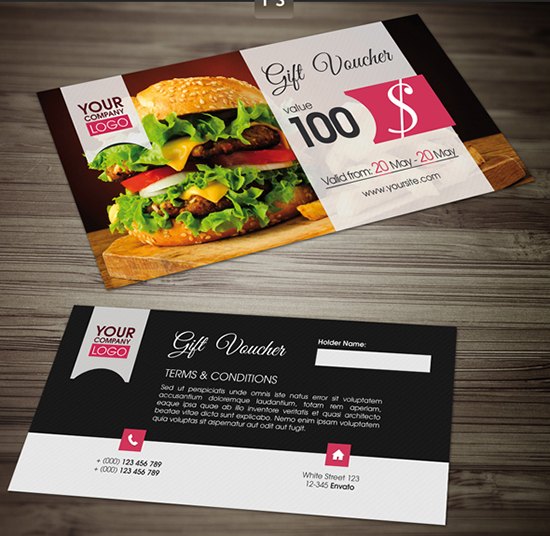 The Food Gift Voucher Template for your business such as a bar, pub, or restaurant. Available in PSD format, all you need to do is just change the text and put your logo.