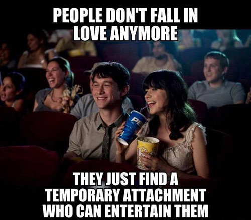 People don’t fall in love anymore. They just find a temporary attachment who can entertain them.