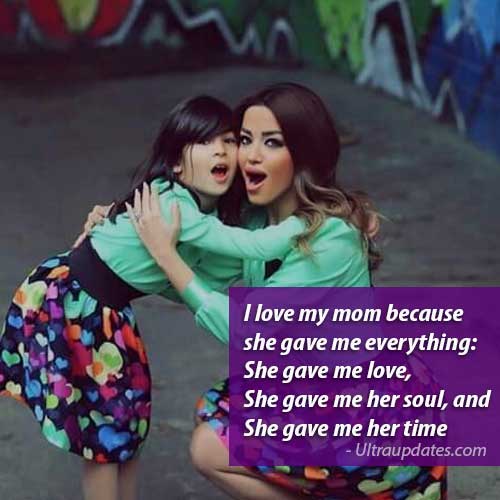 I love my mom because she gave me everything: she gave me love, she gave me her soul, and she gave me her time.