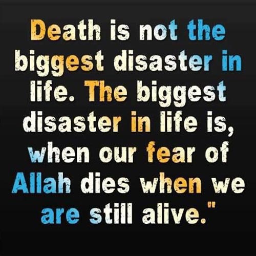 Death is not the biggest disaster in life. The biggest disaster in life is when our fear of Allah dies when we are still alive.