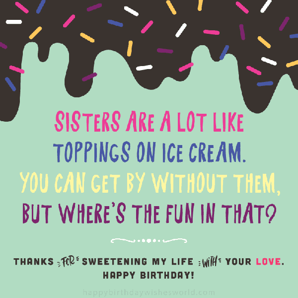 - They always say that you’re the luckiest person in the world if you have a sister. I agree. Sisters make life sweeter and are your best friend for life. Happy birthday.