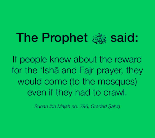 The Prophet (صلى الله عليه وسلم) Said: that if people knew about the reward for the Isha and Fajr prayer, they would come (to the mosques even if they had to crawl)