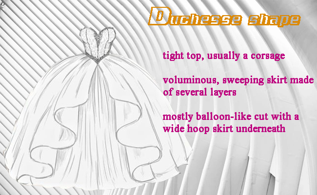 The sweeping princess wedding dress suits almost all figure types. However, very small women should make sure to wear a simple skirt, as this wedding dress shape makes it look even smaller. The bride quickly looks squat.