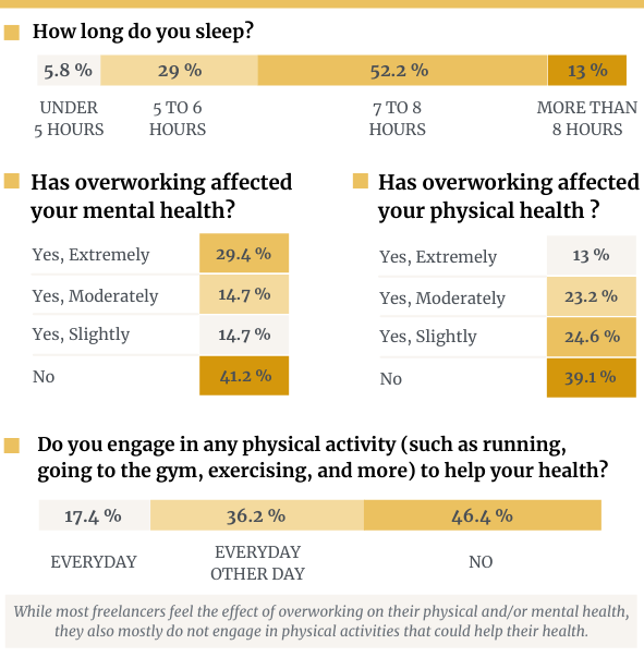 With overworking, burnout is imminent. And with burnout, both effects on physical and mental health are not surprising. The study asked freelancers to grade if overworking has affected their physical and mental health and to what extent.