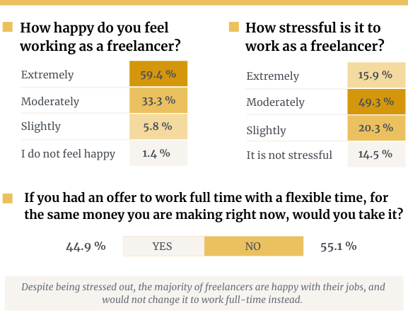 Also, their satisfaction shows in another interesting fact. Namely, 55% of them admitted that they prefer their job as a freelancer to a full-time job with the same pay and flexible hours. However, 45% said they would consider such a job opportunity.