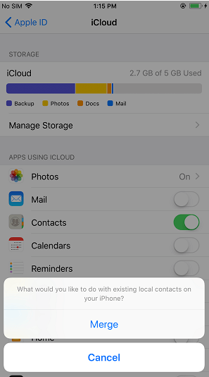Step 3. Toggle on “Contacts” and choose “Merge” when a prompt appears. Then contacts will be saved into iCloud.