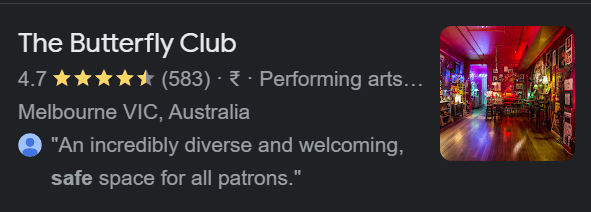 Similarly, if you are looking for a safe nightclub in Melbourne with an average score of 4.7 from 583 reviews, The Butterfly Club, looks like a safe option.