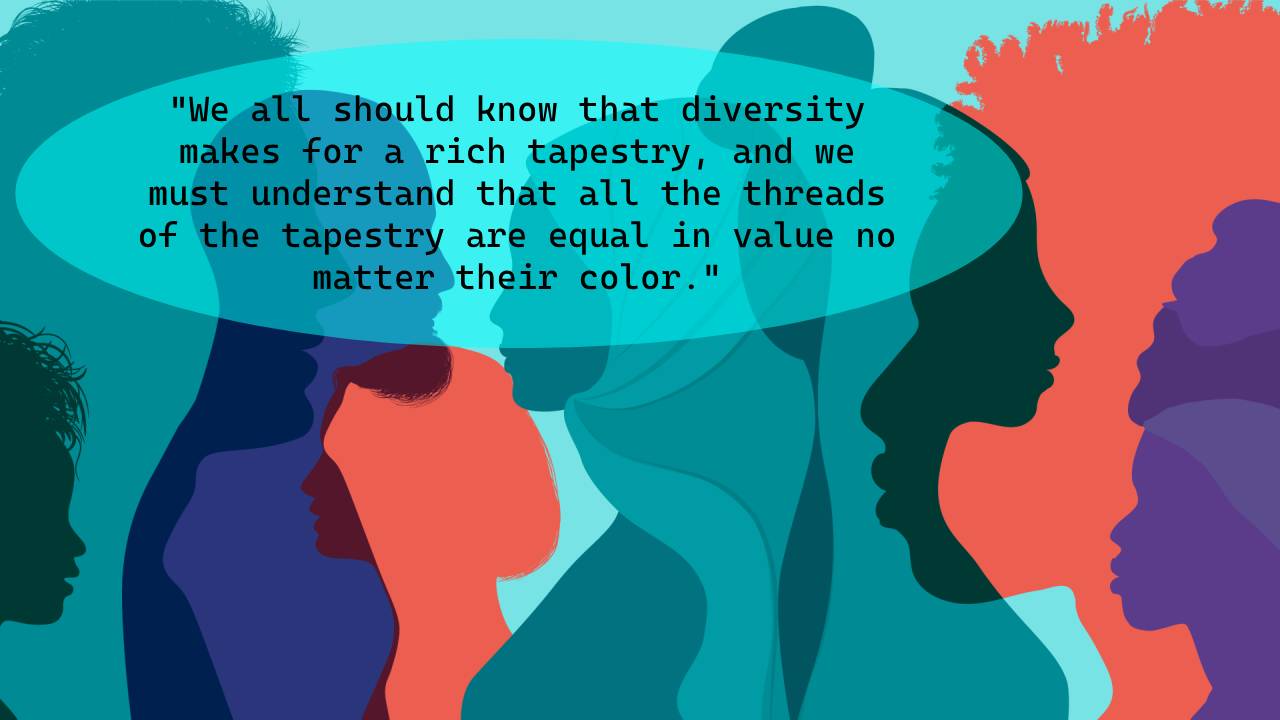 - “We all should know that diversity makes for a rich tapestry, and we must understand that all the threads of the tapestry are equal in value no matter their color.” – Maya Ange .lou