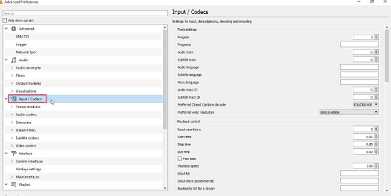- Click the Input/ Codecs option from the left navigation pane and then scroll down to Advanced from the right pane.