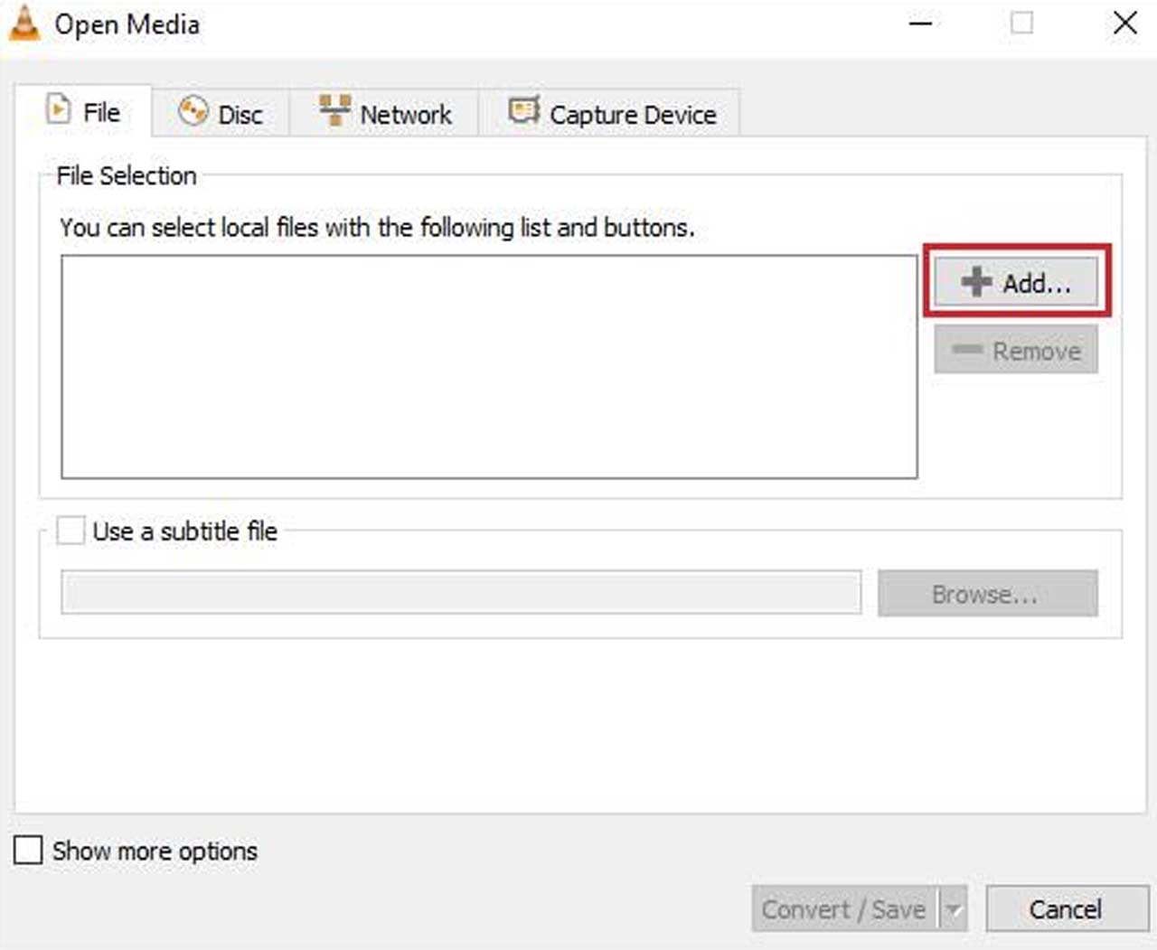 - Click the Add button on the Open Media pop-up to locate your files and add them accordingly.